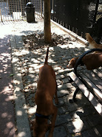 On Friday, we walked down Madison to Madison Square Park, a charming urban gem of a park, thought to be the birthplace of baseball. Contained within its boundaries is an off-leash dog run, which was full of dogs and even another Vizsla. Captain has two annoying dog-park habits: kicking gravel around, and barking loudly, frequently and at nothing in particular. He is starting to acclimate to apartment and urban life in general, and so is much more comfortable being annoying. He did enjoy himself in Jemmy’s Park without annoying me or other people too much. After a while a fourth Vizsla arrived, making it an Official Vizsla Party. There were Cavalier King Charles Spaniels in number, as well as a tribe of fawn-colored French Bulldogs, but it was the Vizslas that brought the outside spectators to the fence to ask what they were.
